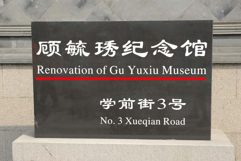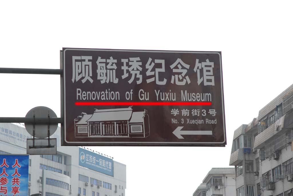 且看"顧毓秀紀念館"的翻譯: Renovation of Gu Yuxiu Museum. 稍有英語語法知識的人都能看出其中蹊蹺, 一前輩的紀念館與"革新(Renovation)"有甚相關?便算相關吧,這"對博物館之革新(Renovation of Museum)"又是何意?也難怪老外們行經此處時搖頭大呼看不明白了.