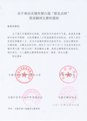 關(guān)于舉辦無(wú)錫市第六屆“新支點(diǎn)杯” 英語(yǔ)翻譯比賽的通知