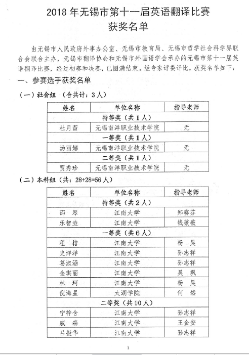 經(jīng)過歷時三個月的初賽、決賽和評卷過程,無錫市第11屆英語翻譯比賽,從2000余名初賽選手中,選出276名參加決賽,最終決出優(yōu)勝者66名,其中:社會組3名,本科組28名,??平M35名。同時涌現(xiàn)出一批優(yōu)秀指導(dǎo)老師、先進(jìn)集體和先進(jìn)個人。