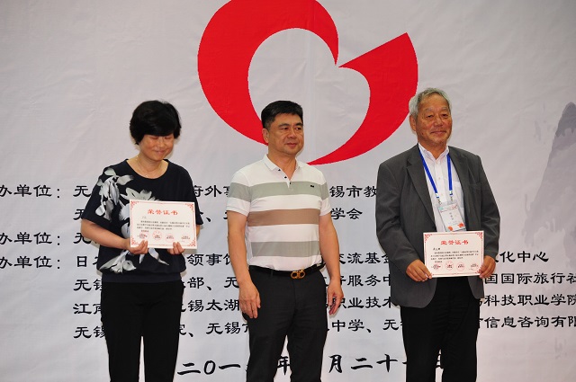 無錫外國語學(xué)會日語分會會長,無錫國旅董事長蔣越慶為本屆大會上開展示范教學(xué)的資深教師岡正典和嚴莉頒發(fā)證書。