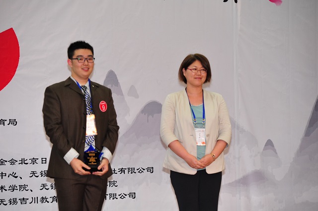日本駐上??傤I(lǐng)事館高岡智子領(lǐng)事為獲得“總領(lǐng)事特別獎”的選手無錫開放大學(xué)魏天豪頒獎。