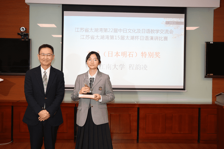 最后公布友城(明石)特別獎和總領(lǐng)事獎獲獎選手名單,江南大學(xué)程韻凌榮獲友城(明石)特別獎,現(xiàn)場由朱政孝代表無錫外辦進(jìn)行了頒獎,蘇州農(nóng)業(yè)職業(yè)技術(shù)學(xué)院葉嘉欣榮獲總領(lǐng)事獎,川畑暁絵副領(lǐng)事進(jìn)行了視頻連線頒獎并予以鼓勵。