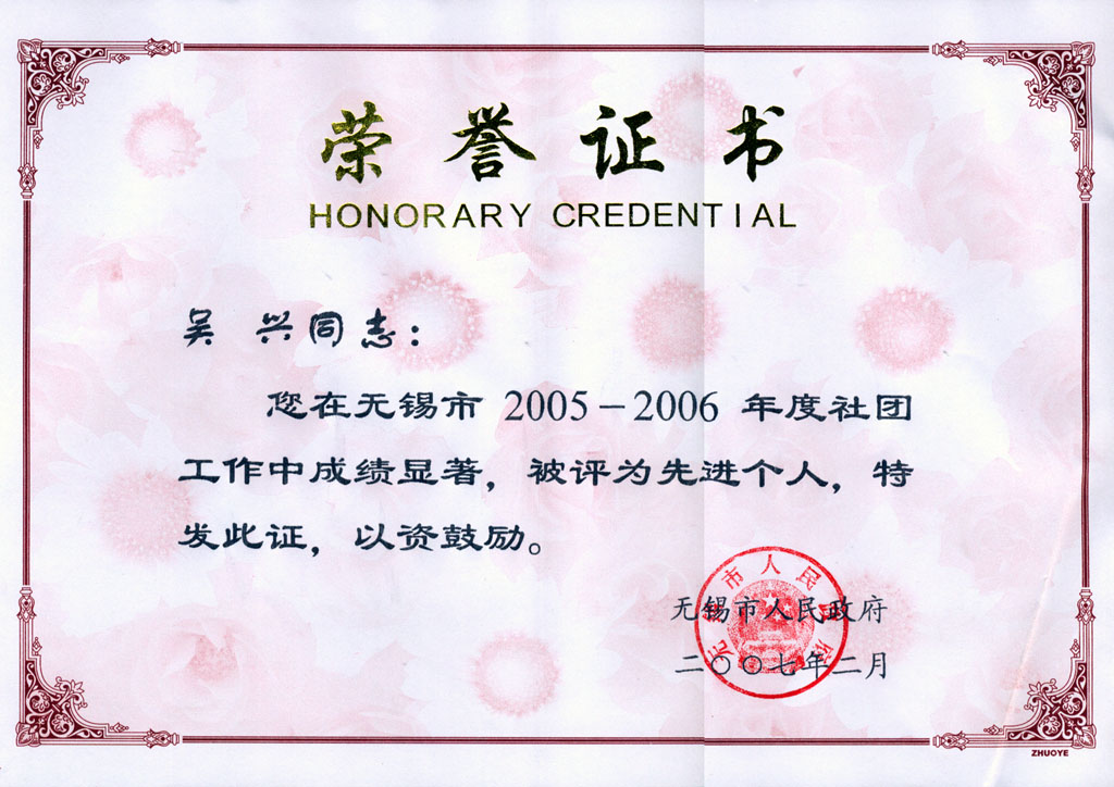 無錫市翻譯協(xié)會秘書長吳興同志榮獲無錫市2005-2006年度社團(tuán)工作先進(jìn)個人稱號