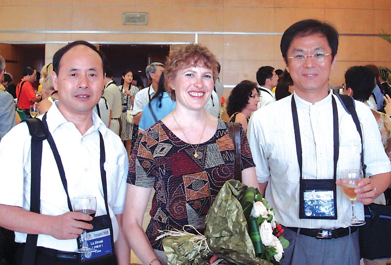 圖為無(wú)錫市翻譯協(xié)會(huì)副會(huì)長(zhǎng)盧新才、秘書(shū)長(zhǎng)吳興與新選國(guó)際譯聯(lián)主席瑪里安·博爾斯合影