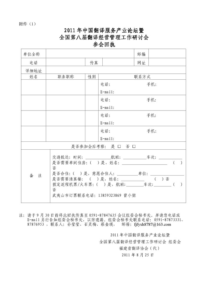 附件(1):《2011年中國翻譯服務(wù)產(chǎn)業(yè)論壇暨全國第八屆翻譯經(jīng)營管理工作研討會參會回執(zhí)》