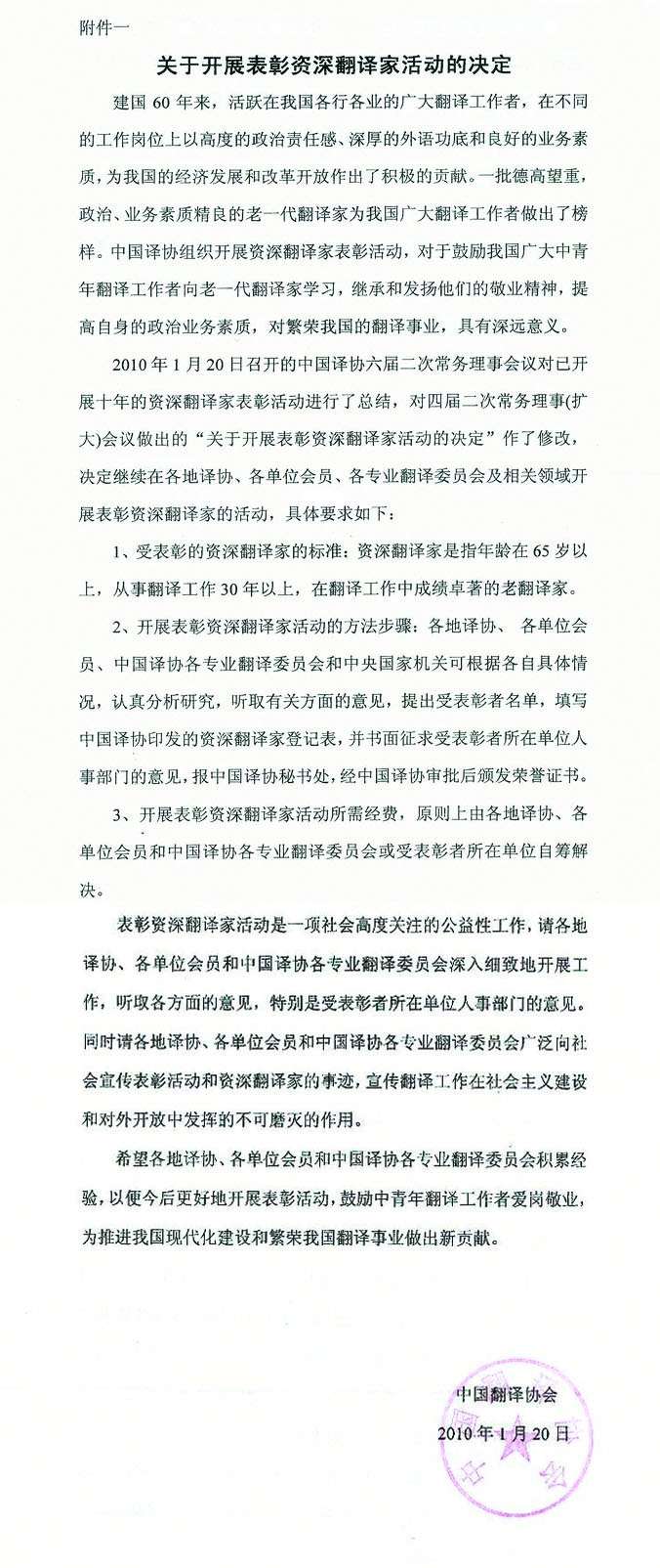 附件一:“關(guān)于開(kāi)展表彰資深翻譯家活動(dòng)的決定”
