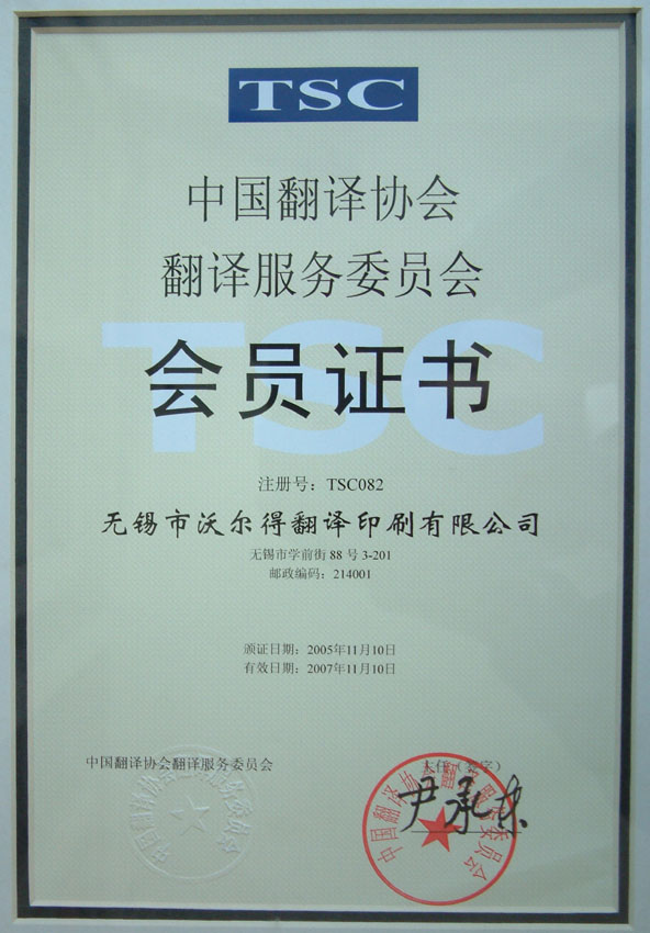 中國翻譯協(xié)會翻譯服務(wù)委員會會員證書