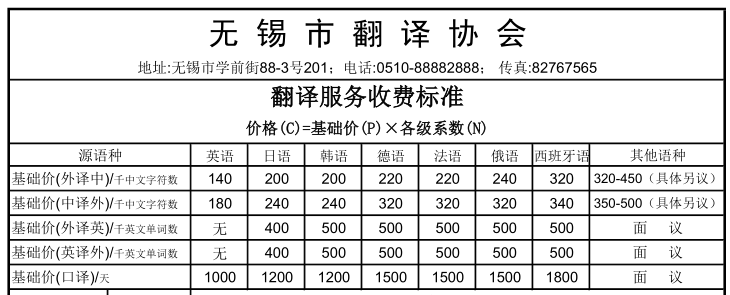 不同級(jí)別的筆譯翻譯服務(wù)的價(jià)格計(jì)算公式為:價(jià)格(C)=基礎(chǔ)價(jià)(P)×各級(jí)系數(shù)(N)。